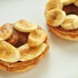 - Slice the banana into 1/4 inch circles and place on top of the peanut butter mixture. Lightly sprinkle the coconut sugar on the top of each banana.