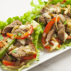 If you’re a cilantro lover, finish these Low-Carb Philly Cheesesteaks off with a sprinkle of fresh cilantro. Serve hot for the perfect clean, low-carb game day meal. A twenty minute recipe, these healthy cheesesteaks are easy to throw together during halftime so you can have dinner on the table before the third quarter.