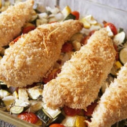 - Toss zucchini, squash, garlic, and cherry tomatoes, and thyme in olive oil and spread on the bottom of a 13 x 9-inch baking dish. Top with chicken breasts.