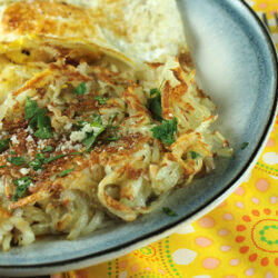 Shredded potatoes get a punch of flavor from savory grated cheese in this Parmesan hash browns recipe. It comes together easily for a morning breakfast and is healthier and tastier than anything you can buy in the freezer aisle at your grocery store. Don’t skip the step of salting your potatoes; that’s what gives you the crispy browned crust and delicious flavor.