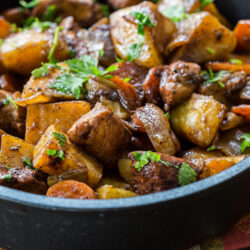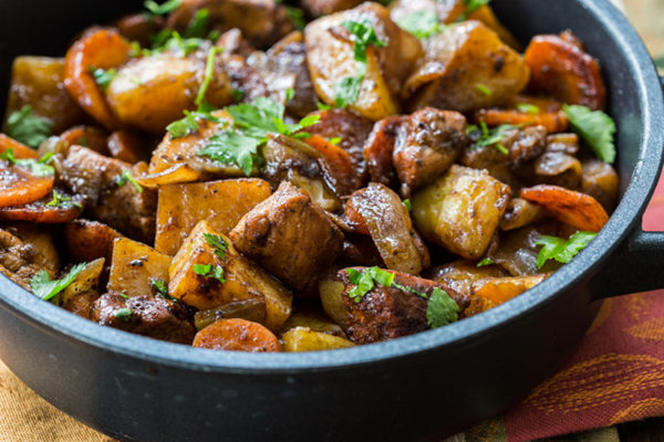 These nutritional properties make quite a treasure chest of health benefits. Tender, crispy chicken meets juicy carrots and deliciously smooth potatoes in this skillet dish. The meat packs a protein punch while the veggies offer incredible nutrients like Vitamin B6, potassium, copper, and Vitamin C.