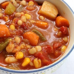 This uber-comforting Slow Cooker Bean & Vegetable Soup makes a perfect weeknight meal after a busy day. The vegetarian-friendly dish calls for 100% clean, totally nutritious ingredients that deliver a host of health benefits. The green beans and carrots taste soft and chewy once cooked, while the corn kernels and diced tomatoes merge deliciously with the other vegetables while offering juicy flavor. At the same time, the Great Northern beans pack a protein punch certain to keep you full and satisfied for hours. This colorful creation is a snap to whip up, and stores soup-er well overnight! Simply toss ingredients into your slow cooker, stir, and let the appliance work its magic.